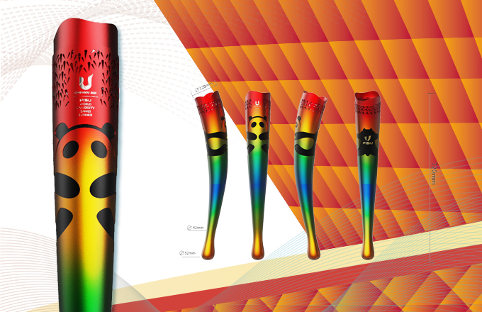 成都大运会火炬“蓉火”取成都的简称“蓉”,同时寓有“融合”“包容”之意。火炬运用多彩渐变的大运会主视觉色块,将朱红、明黄、翠绿、湖蓝四个渐变色整合起来,又呈现成都热情、活力、时尚的多彩生活与大学生的斑斓青春。