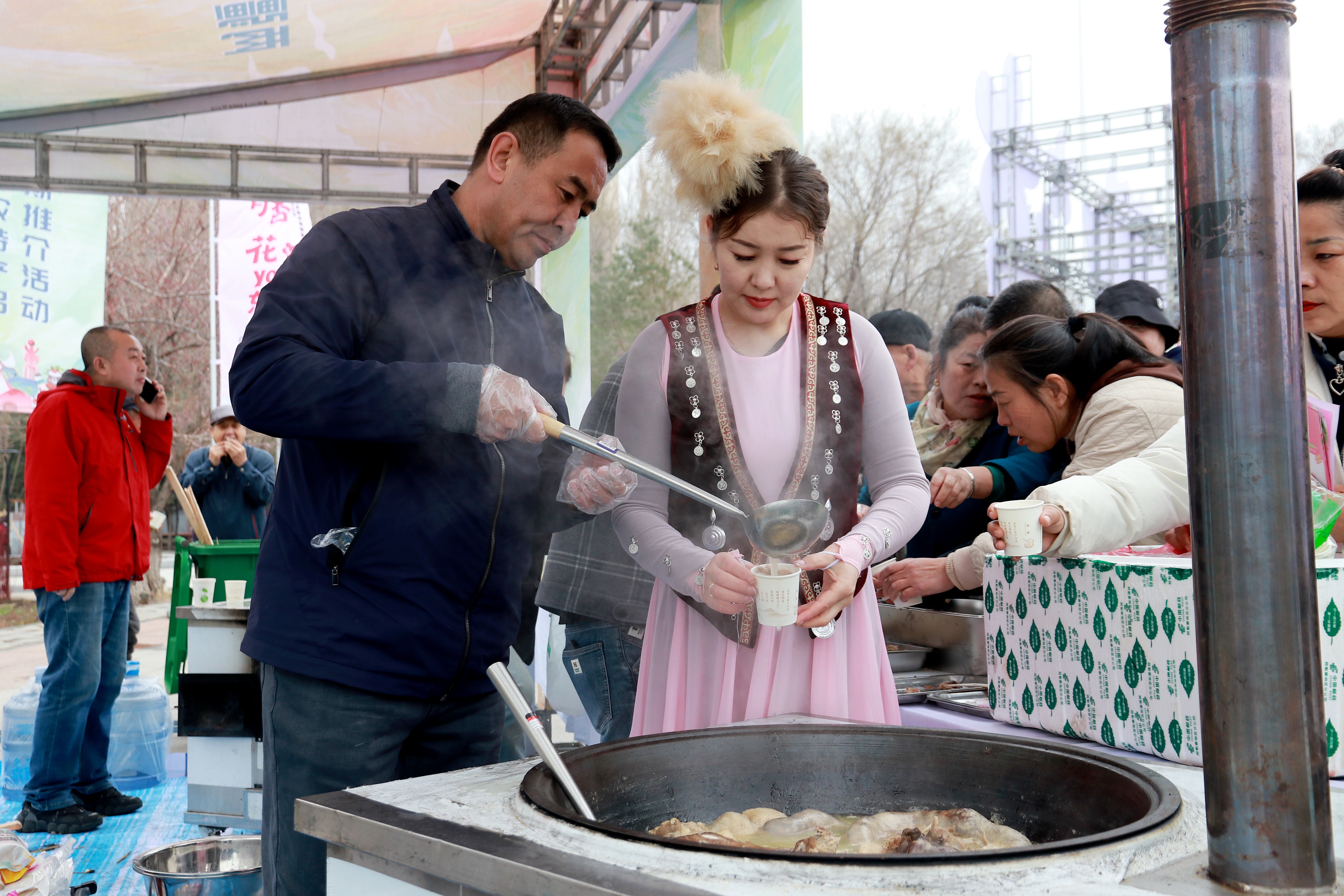 要说现场最具人气的,非飘着浓郁香气的新疆美食摊位莫属。佳木斯市对口援助城市新疆富蕴县为杏花游专程送来了美食和特产,新鲜出炉的牛肉串、羊肉串在炭火上滋滋作响,金黄油亮,孜然与香料的香气随风飘散,瞬间吸引了大批游客前来品尝。人们手持香气四溢的肉串,大快朵颐,赞不绝口。游客李先生边吃边赞叹:“真没想到在佳木斯能吃到这么正宗的新疆美食,肉质鲜嫩,味道绝了!” 新疆美食的亮相,不仅为游客带来了舌尖上的全新体验,更在两地之间架起了一座文化交流的桥梁,让佳木斯市民和游客领略到新疆的独特风情,也让新疆美食在东北大地绽放出别样光彩。
