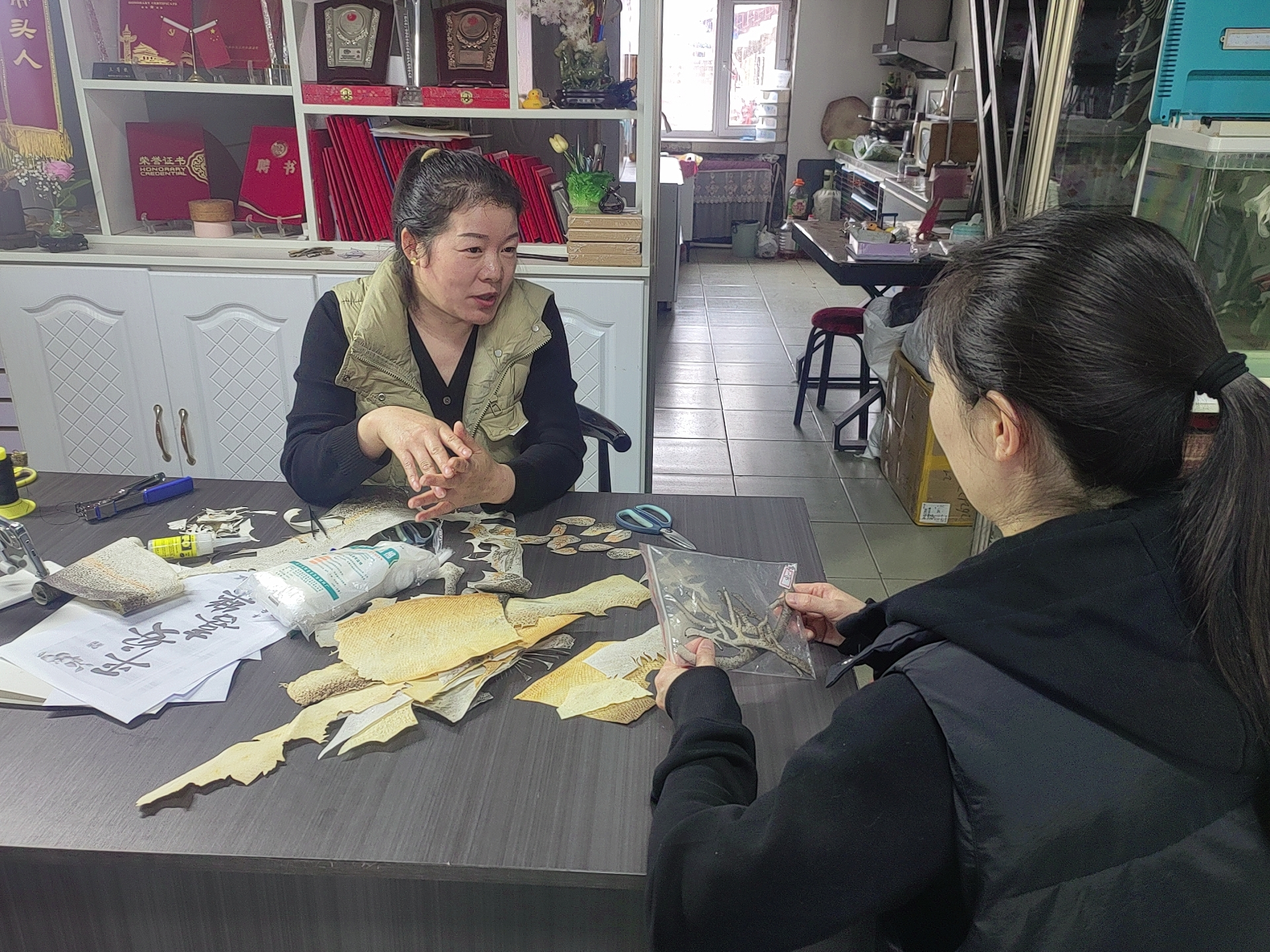 2024年春夏季,团队走进赫哲族聚居地饶河县,跟随黑龙江省非物质文化遗产赫哲族鱼皮制作技艺市级代表性传承人——刘志红,学习鱼皮画制作技艺。在一次次鞣制、拼粘、缝制的实践中,深刻体会到鱼皮画背后“以江为生”的生态智慧。“过去一张鱼皮能做好几件工艺品,现在野生鱼少了,材料成本高了不少。”刘志红的感慨让团队意识到:非遗传承的困境,本质是生态之困。