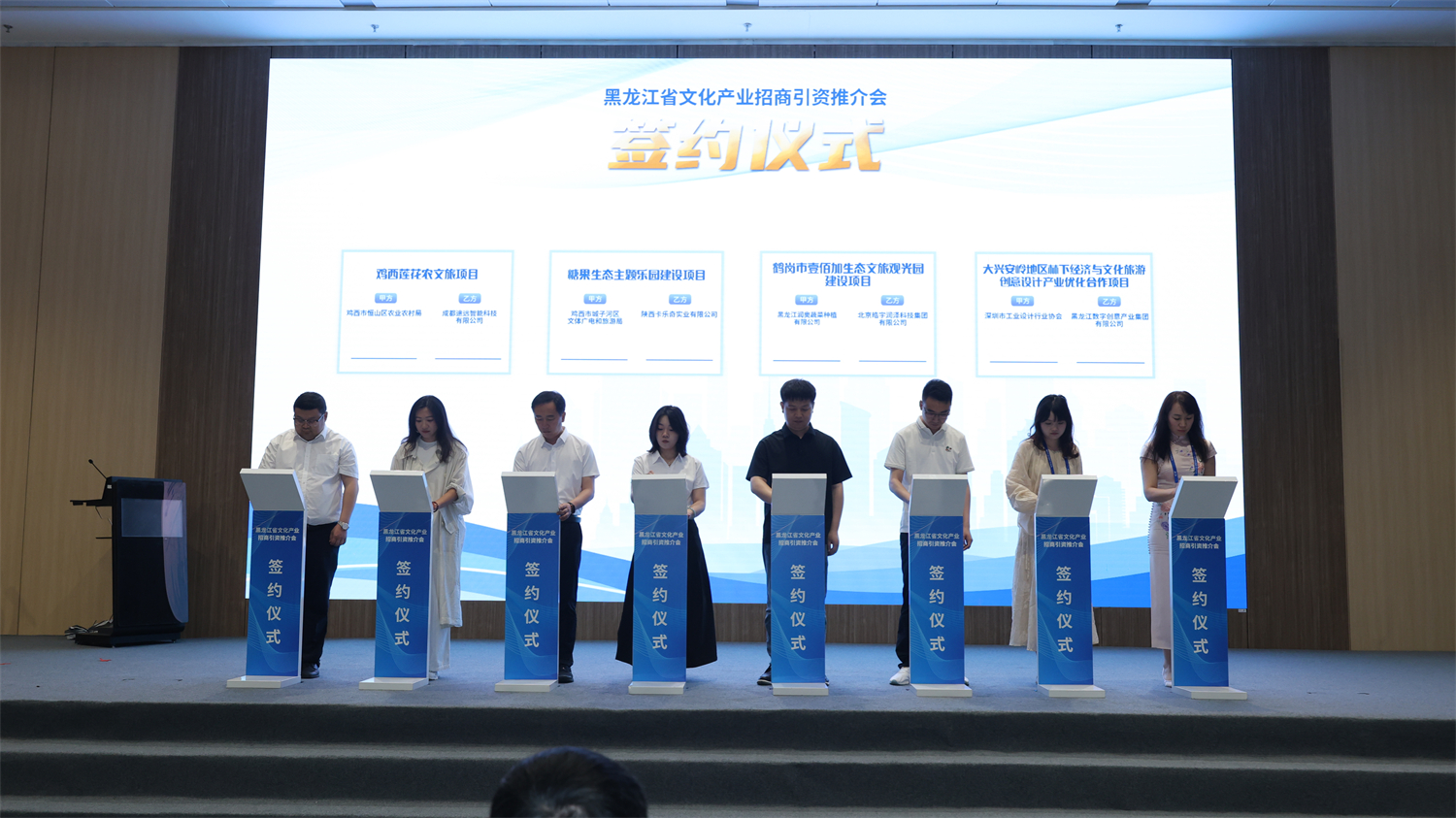 推介会现场聚焦文化创意、文化旅游、特色产业等领域,重点推介了6个项目。文化创意方面,牡丹江市以网络文学IP动漫化开发拓展文化产业链,赫哲族非遗资源通过“神偶吉祥物IP”和数字技术实现文化创新转化;文旅板块重点推出哈药六文旅小镇招商项目、重点推介黑龙江省第七届旅游产业发展大会,以开放姿态广邀合作,全力推动文旅产业高质量发展;特色产业方面,火岩瓷项目以火山岩为基因载体,通过材料科学与工艺美学的双重突破,构建“地质禀赋+人文表达+功能创新”的三维价值体系。系列推介项目通过IP开发、科技融合和全域旅游打造区域经济新增长点,为投资者提供文化产业转型、特色产品开发及文旅消费升级的多维合作机遇。推介会还促成了14组项目现场签约,涵盖传媒合作、文旅开发、创意设计等多个领域,签约双方将通过优势互补、协同创新,在市场拓展、技术研发、产业链整合等方面合作实现共赢。
