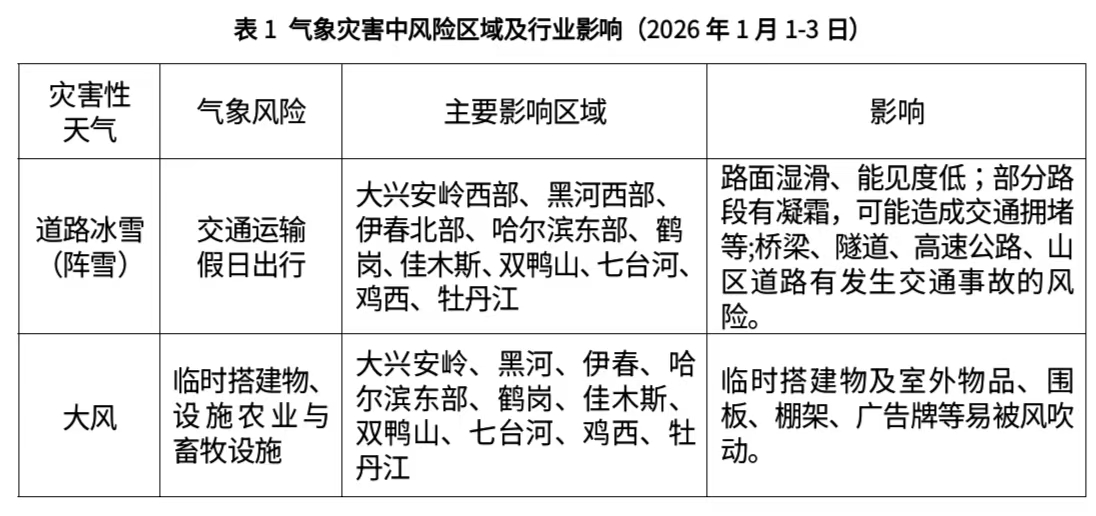 假日期间(2026年1月1至3日)全省大部以晴到多云天气为主,仅1日东部地区、3日北部和东部部分地区有阵雪。气温回升,大部地区平均气温接近常年同期,大兴安岭高2℃左右;最高气温大部地区-18℃~-8℃,最低气温北部地区-32℃~-26℃,南部和东部地区-24℃~-18℃。
