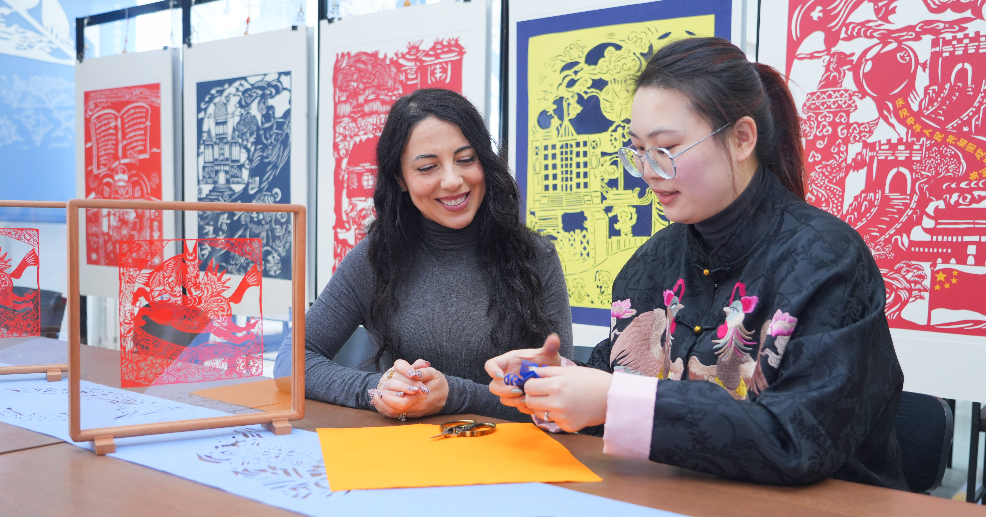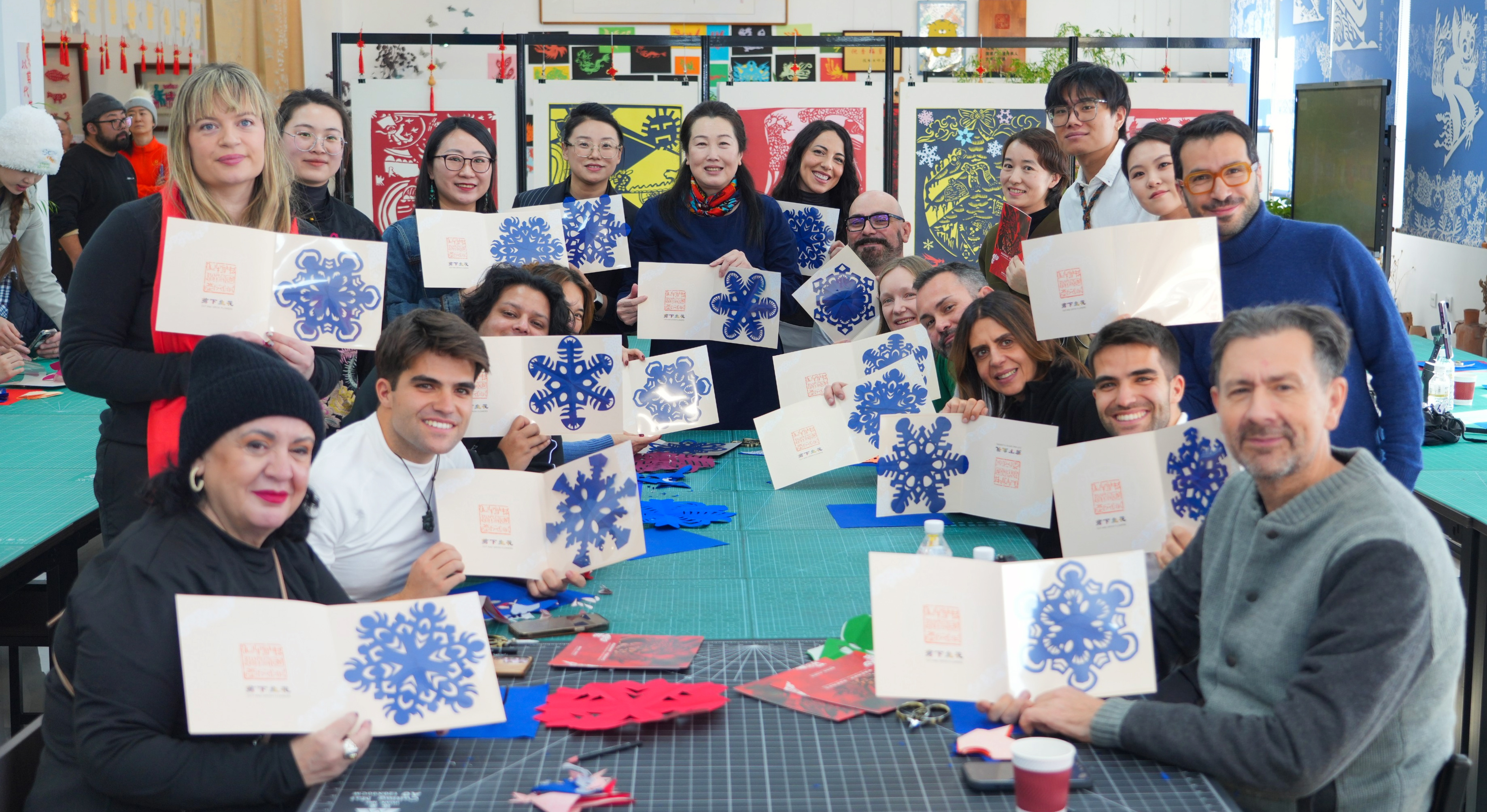 英国旅游博主ANOK在老师指导下,不太熟练地完成了一朵蓝色雪花剪纸作品。“太神奇了,一张纸能承载这么多冰雪故事,我要把这份作品带回家乡。”ANOK小心翼翼地将作品收入信封。现场,考察团成员纷纷拿起剪刀尝试创作,纸张上剪刀穿梭,不一会儿便诞生出一个个灵动的雪花剪纸,大家互相展示成品,用英语交流创作心得,非遗技艺在互动中悄然传递。