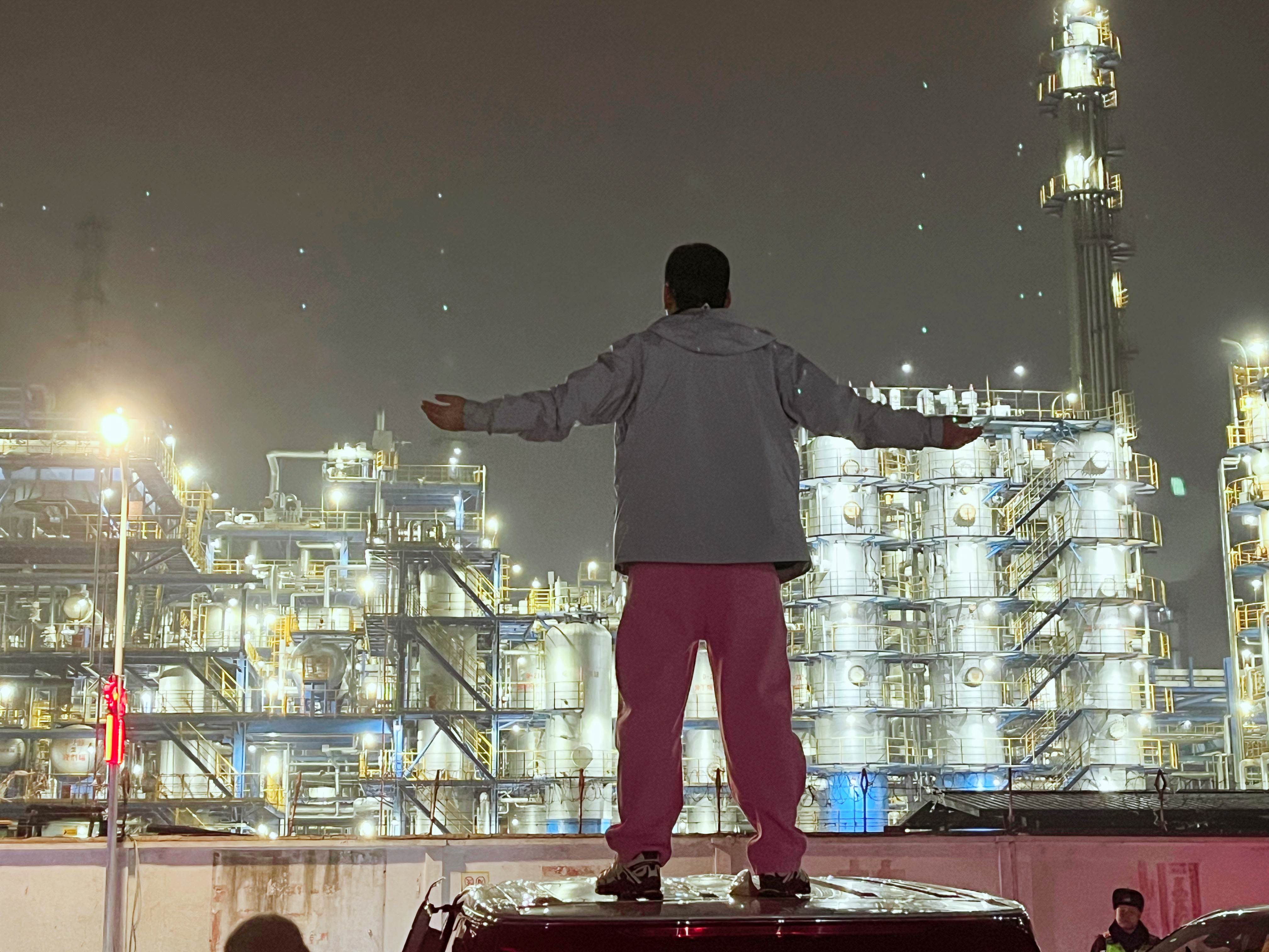 夜幕降临,便是这片“钢铁森林”的主场。“18点至21点是打卡的黄金时段——夜幕下,冷白色的灯光沿着高耸的塔罐、蜿蜒的管线缓缓攀爬,暖黄色的灯带点缀其间,自带‘生人勿近’的冷峻气场,却又充满致命吸引力。”一位摄影师如此说道。