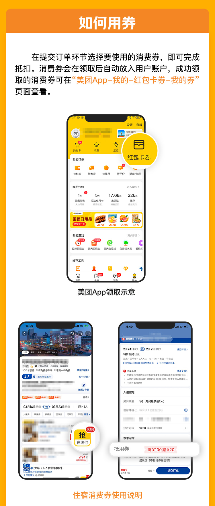 使用方式:选择支持消费券的商品结算,满足满减条件即可自动抵扣,每笔订单限用1张消费券。