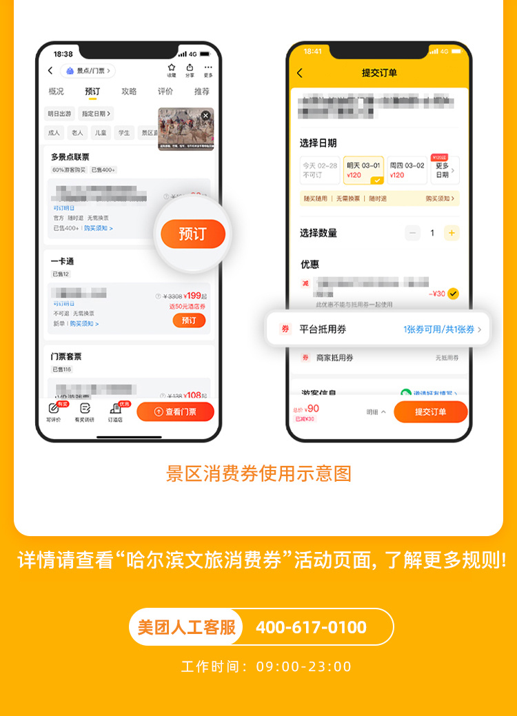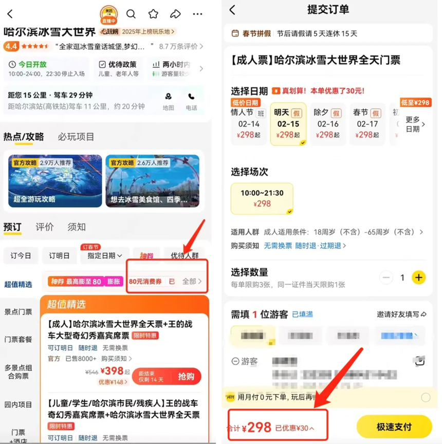 领取方式:在携程旅行APP/小程序,可通过首页“门票/酒店”频道定位哈尔滨,选择带“冰城消费券”标签的产品点击“领券订”,或直接搜索“哈尔滨文旅消费券”进入活动页面抢券。