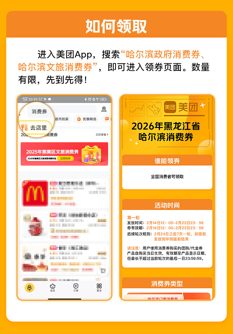 领取方式:进入美团App/大众点评App,搜索“哈尔滨政府消费券”或“哈尔滨文旅消费券”,即可进入领券页面,数量有限,先到先得。