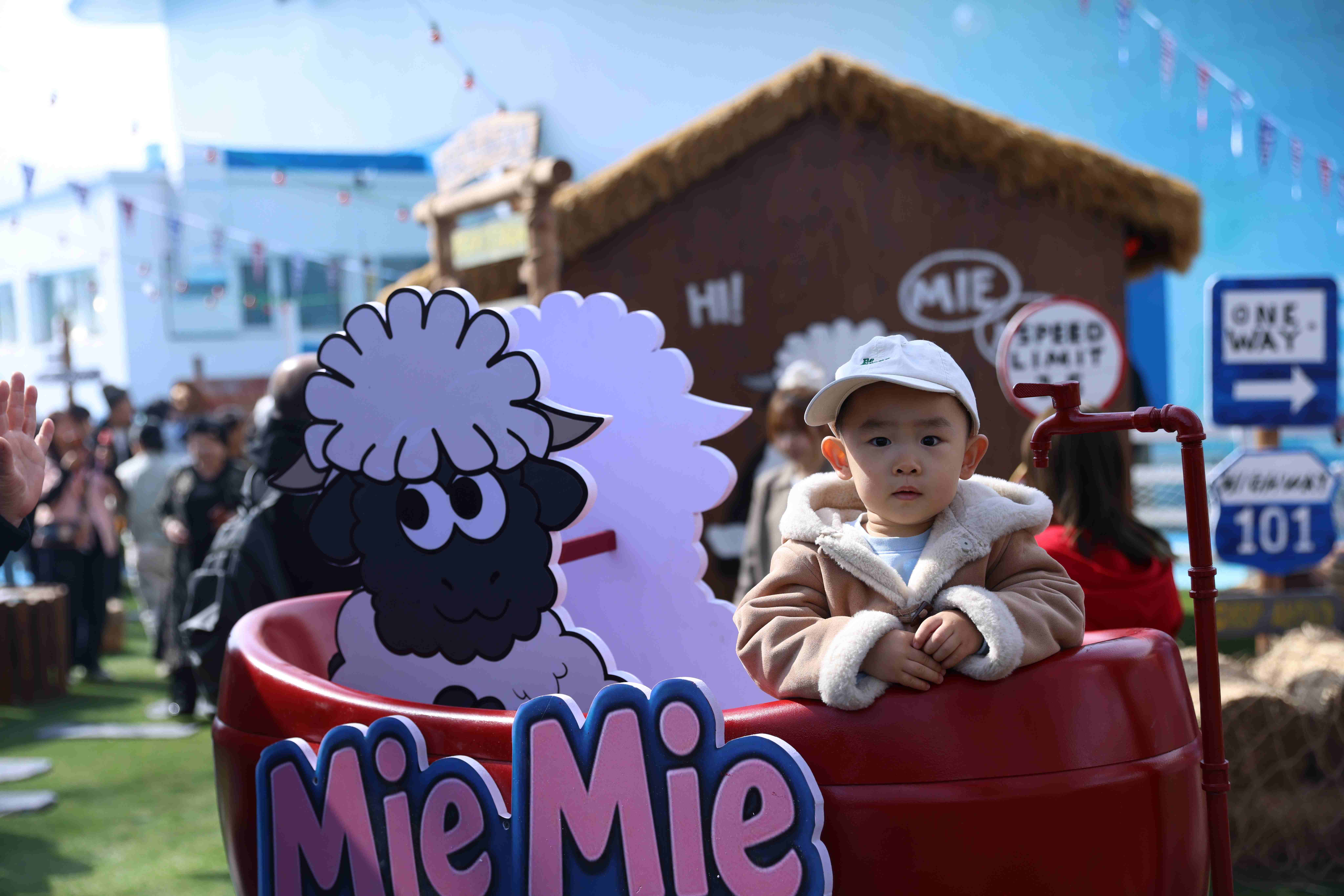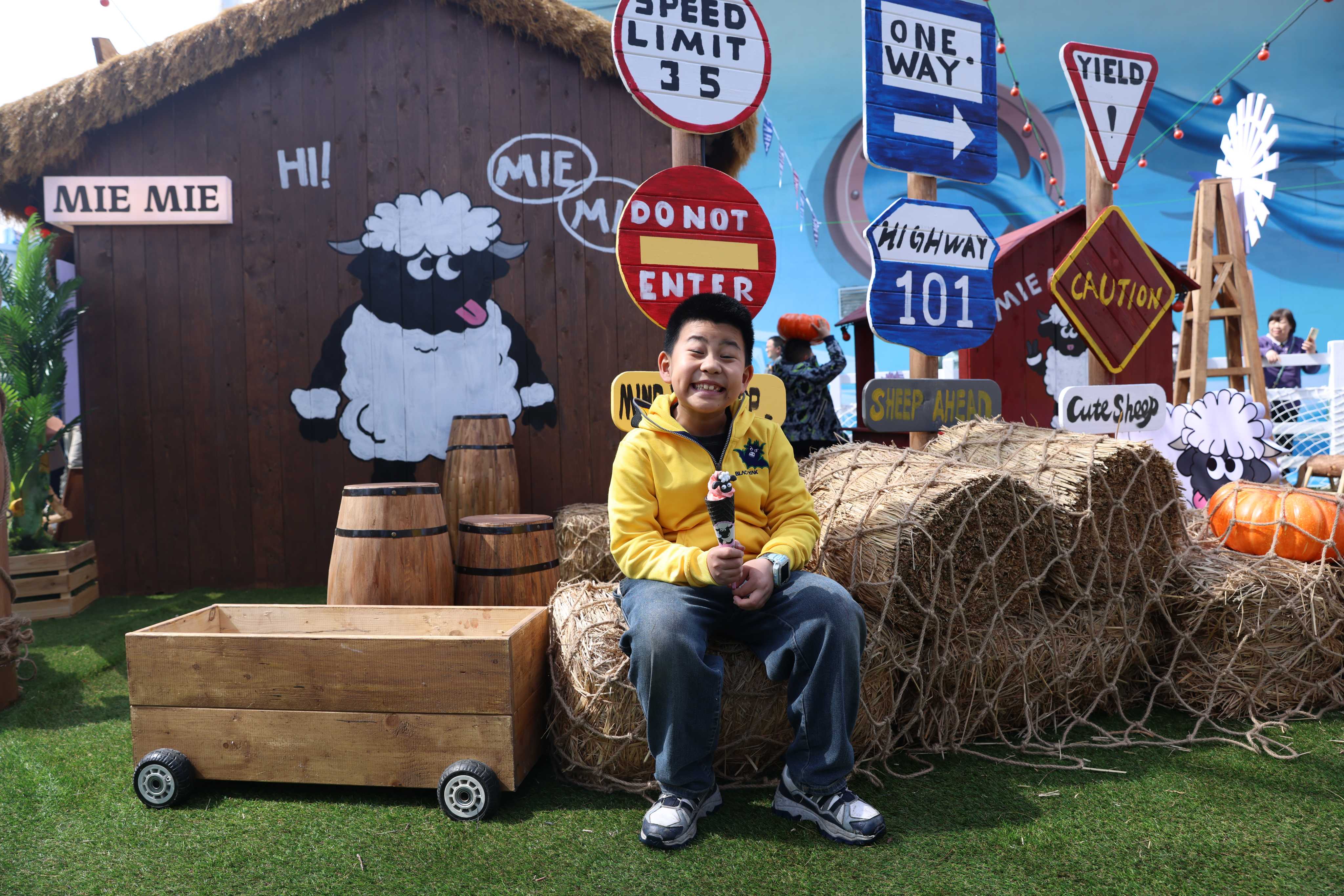 尤为亮眼的是,咩咩农场重磅推出了以瓦莱黑鼻羊为原型的原创动物IP——“夹克”与“肉丝儿”。这对呆萌可爱的IP形象不仅作为农场的专属文化符号遍布各处,更衍生出系列原创IP音乐、主题歌舞演出及丰富多样的文创周边。在咩咩舞台区域,原创小羊主题音乐歌舞演出精彩上演,牛仔NPC化身农场伙伴与游客亲密互动,让欢乐氛围持续升温。游客还可前往文创市集区挑选心仪的IP衍生品,或品尝特色主题美食,全方位构建“可看、可玩、可购、可留”的立体化文旅体验。