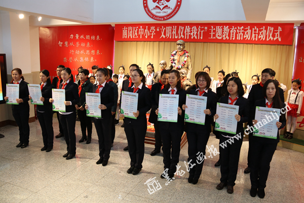 仪式现场,与会领导为教师代表颁发了《文明礼仪公约》牌。最后在“我承诺,我践行”环节中师生及家长代表与各级领导共同进行了签名承诺。