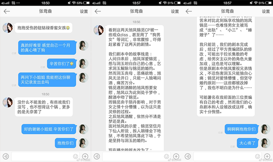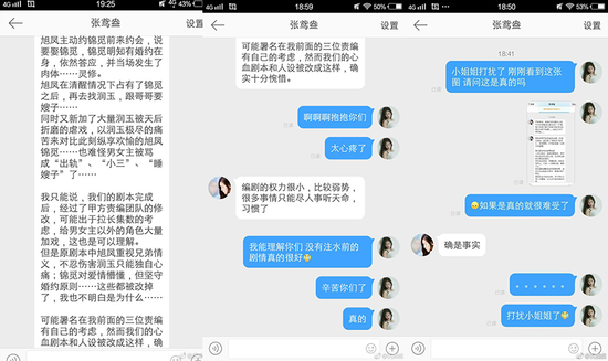 网易娱乐8月26日报道 25日晚,有网友曝光与古装神话剧《香蜜沉沉烬如霜》编剧张鸢盎一组对话,疑似证实“阴阳剧本”两个编剧团队的存在,将男女主戏份大量删减为男二加戏。
