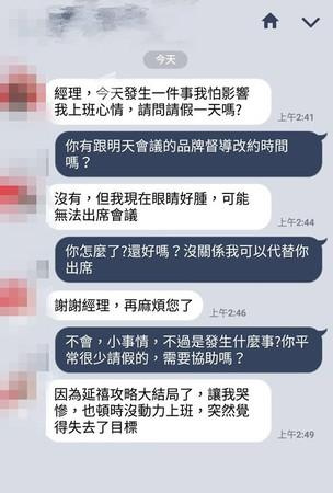 一位网友在社交网站上透露,半夜收到工作伙伴临时请假的简讯,“今天发生一件事,我怕影响我上班心情,请问(可以)请假一天吗?……我现在眼睛好肿,可能无法出席会议。”看起来心情相当低落,原博担心地询问:“你怎么了?还好吗?……你平常很少请假的,需要协助吗?”