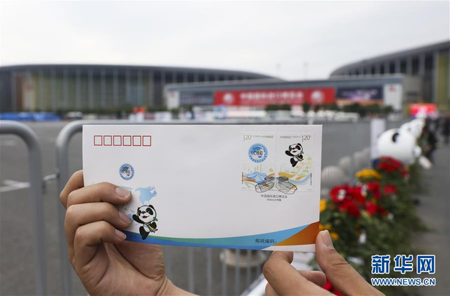 当日,中国邮政发行《中国国际进口博览会》纪念邮票。 新华社记者 王益亮 摄