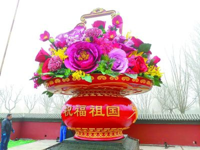 二分之一比例的天安门“祝福祖国”大花篮安放在世园会企业展园。