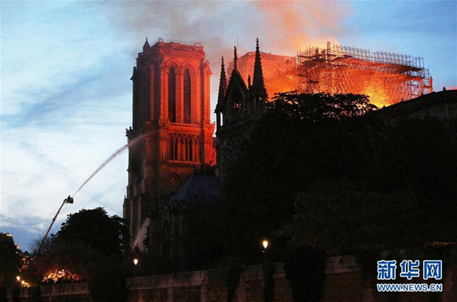 4月15日,在法国巴黎,巴黎圣母院燃起大火。位于法国首都的巴黎圣母院15日傍晚发生大火,造成巴黎圣母院塔尖倒塌,建筑损毁严重。目前尚无人员伤亡的报告。新华社记者 高静 摄