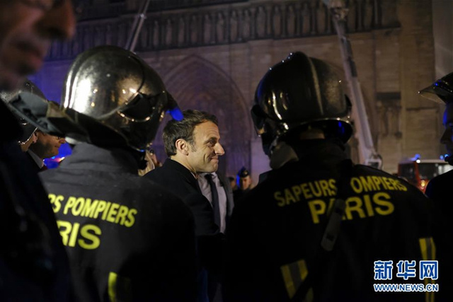 4月15日,在法国巴黎,法国总统马克龙(中)在火灾现场视察。新华社发(亚历山大·卡曼 摄)