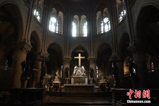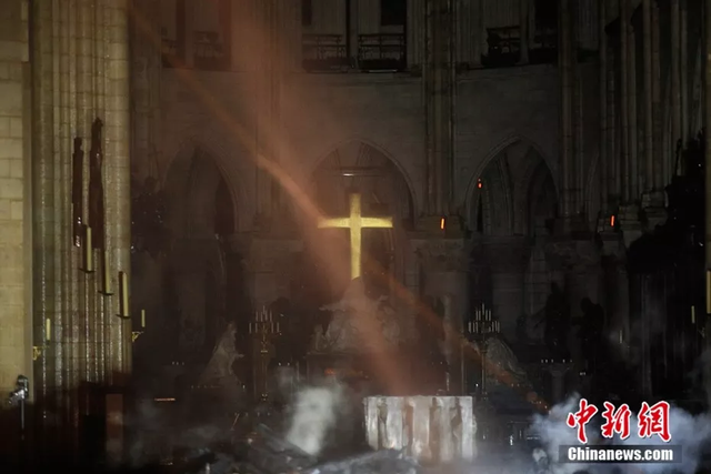 大火后教堂内的祭坛和十字架,巴黎圣母院着火时的内景。