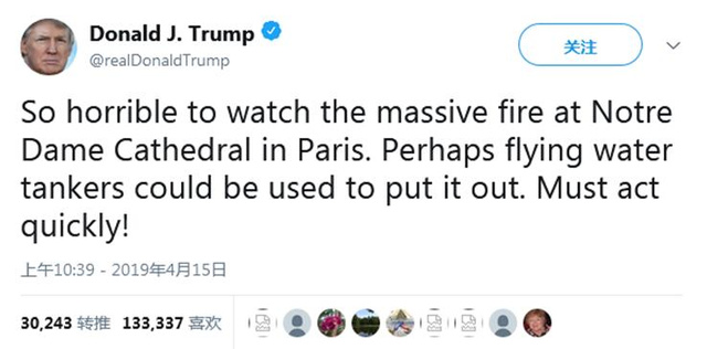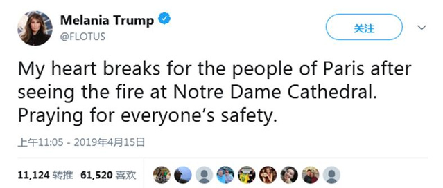美国总统特朗普在推特上表示,“看到”教堂被烧毁是“可怕的”,并建议可以用“飞行的水箱”来扑灭它。美国第一夫人梅拉尼娅·特朗普也表示同情,称她为法国人民“心碎”。
