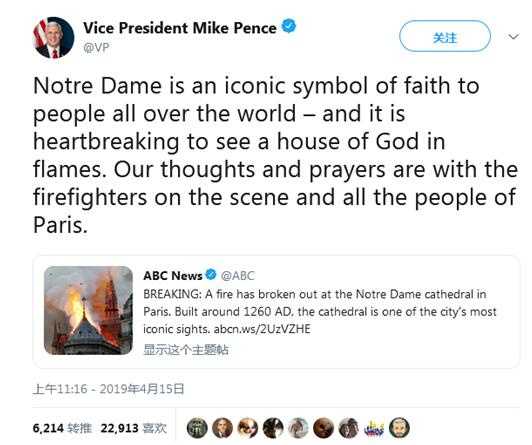 美国副总统彭斯也转发美国广播公司推文称,“看到上帝的房子在火焰中令人心碎”并为消防员和巴黎人民祈祷。