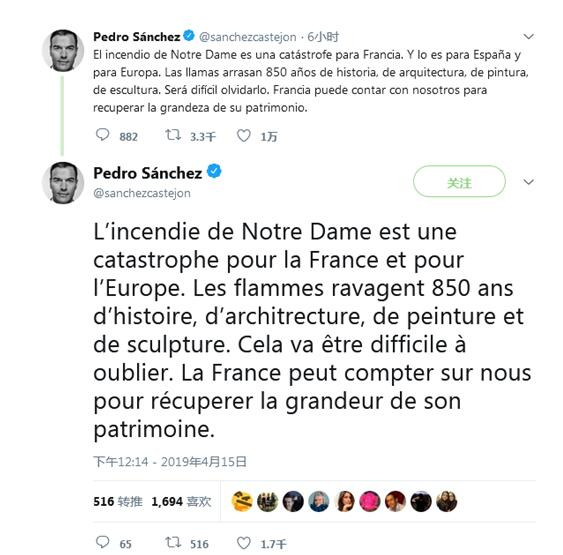 西班牙首相佩德罗·桑切斯在推特上写道,这场大火对法国和整个欧洲来说都是一场“灾难”,大火吞噬了“850年的历史、建筑、绘画和雕塑”。