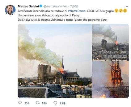 意大利副总理兼内政部长马泰奥·萨尔维尼表示,愿意为法国提供力所能及的帮助,并对大教堂发生的“可怕火灾”表示哀悼。