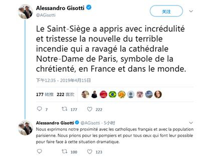 梵蒂冈发言人@AGisotti在推特上表示,对于发生在巴黎圣母院的毁灭性大火,教廷感到“震惊和悲伤”。他表示正在为消防员祈祷,“我们表达了我们与法国天主教徒和巴黎人民的亲密关系,我们确保他们得到我们的祈祷。”