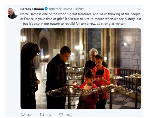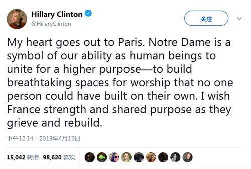 美国前总统奥巴马在推特也表达了惋惜,称“巴黎圣母院是世界上最宝贵的财富之一”,他同时呼吁 “为了(圣母院的)重建”,“我们”要“尽所能坚强”。美国前国务卿希拉里·克林顿也表示,大教堂象征着我们人类具有为更高目标团结起来的能力。