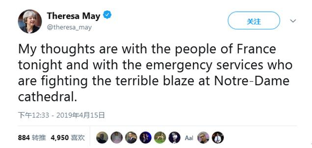 英国首相特蕾莎·梅也发推表示,今夜她的心“与法国人民同在”。而德国总理默克尔则通过发言人表示,她对大火“深感悲痛”。