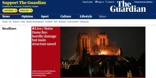 《卫报》网站头条标题:巴黎圣母院大火造成严重毁坏 但主建筑幸存。图片来源:《卫报》网站截图