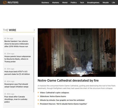 路透社网站标题:巴黎圣母院毁于火海。图片来源:路透社网站截图
