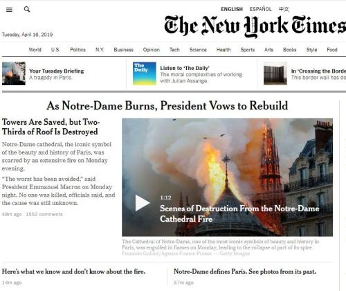 《纽约时报》网站标题:巴黎圣母院发生大火,法国总统马克龙誓言重建。图片来源:美国《纽约时报》网站截图