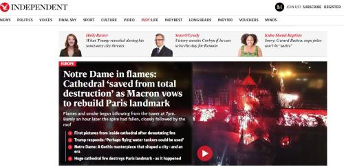 《独立报》网站标题:巴黎圣母院大火:历史地标性建筑的屋顶和塔尖倒塌。图片来源:《独立报》网站截图