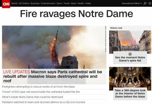 CNN网站标题:大火毁坏巴黎圣母院。 图片来源:CNN网站截图