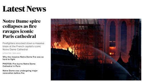 以下是部分外媒对巴黎圣母院大火的报道截图: