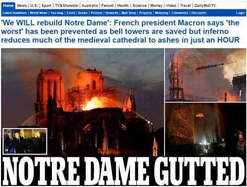 《每日邮报》网站标题:巴黎圣母院被烧毁。图片来源:《每日邮报》网站截图