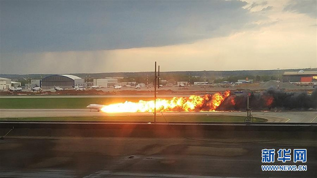 俄罗斯一客机起火.5月5日,一架客机在俄罗斯首都莫斯科谢列梅捷沃机场迫降。俄罗斯联邦侦查委员会发言人彼得连科5日表示,当天在莫斯科谢列梅捷沃机场迫降后烧毁的客机共载有78人,目前可确认其中37人生还。新华社发(谢尔盖 摄)