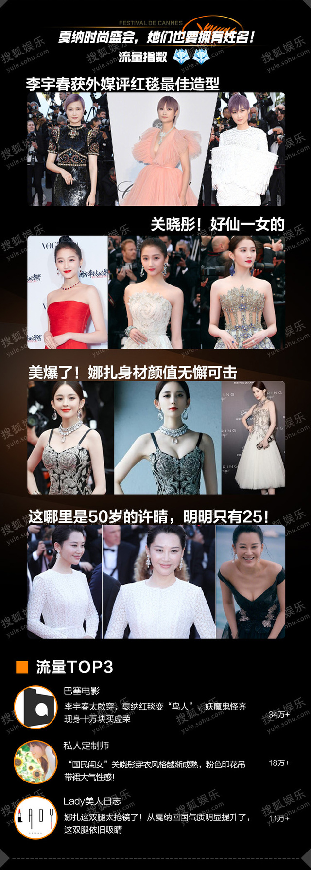 戛纳电影节每年都能吸引无数男女明星前来,不管有没有作品,走上红毯,穿对了你就是最亮的星星!去年,李宇春的造型就得到了网友好评,今年更是被外媒评为了红毯最佳造型,不得不说,李宇春的时尚感太强了!关晓彤今年也非常拼,换了好几套礼服,每一套都非常仙儿!颜值身材俱佳的她,未来想必也是时尚的宠儿呢!娜扎来到戛纳红毯,保持了日常的发挥,白到发光,奶油美腿让人羡慕,好美一女的!邻近结束时,许晴带着《倒背藏身》现身戛纳,看到50岁许晴的身材和颜值,我慕了。