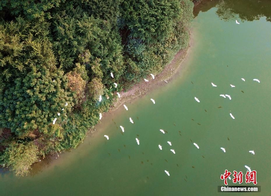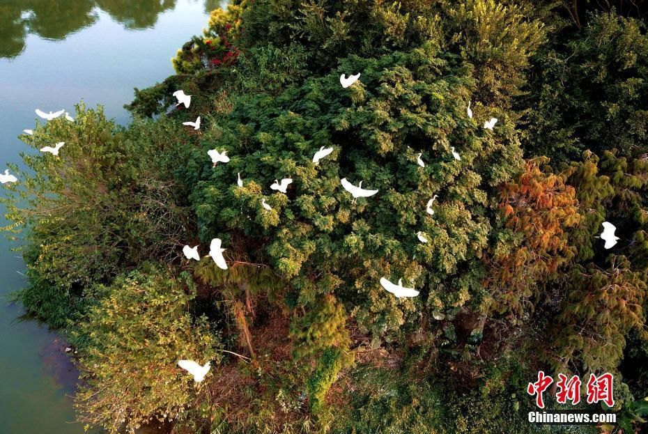 11月13日,空中鸟瞰位于福建漳州碧湖的“心岛”,岛周白鹭纷飞。近年,随着生态环境的不断好转,碧湖已成为漳州的一张名片,吸引许多市民在此休闲娱乐。(航拍图片)中新社记者 王东明 摄