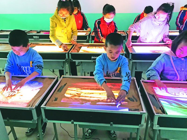 13点,上课铃响起,清脆的读书声弥漫在远山和眼前村庄上空。在沙画室内,孩子们正在沙盘上画着美丽的梦想。