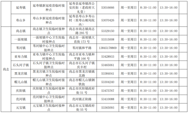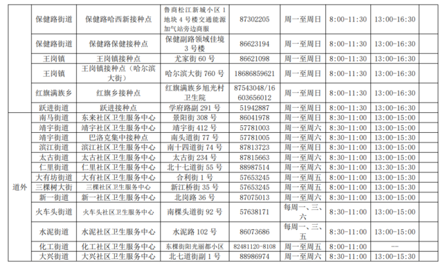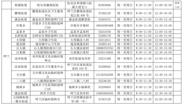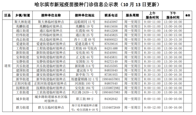 黑龙江网10月13日讯( 记者 王忠岩)为筑牢免疫屏障,按照国家、省部署,哈尔滨市开展了第三针新冠疫苗接种工作。10月10日开始恢复了新冠疫苗接种门诊,处于中风险地区的接种门诊正在陆续恢复中。为了更好的提供便民服务,助力新冠疫苗接种,现将今日统计的哈尔滨市新冠疫苗接种门诊信息公示表更新如下:
