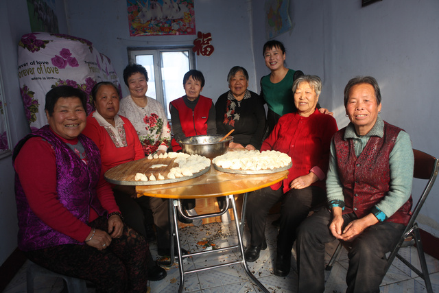 郭炳莉和管理区的老人们一起包饺子庆祝重阳节