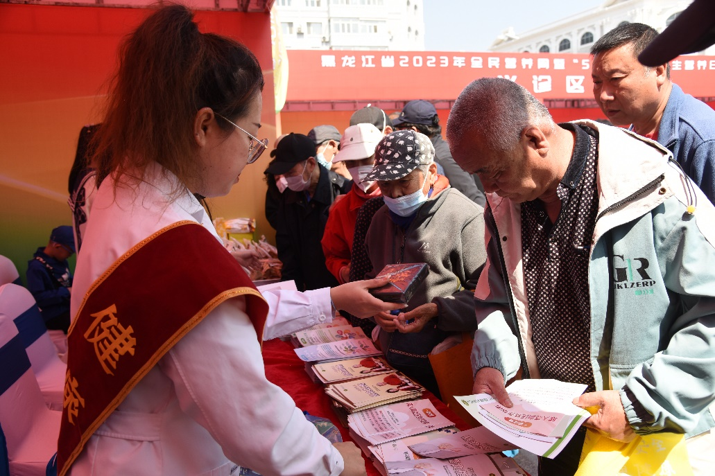 活动现场,哈尔滨医科大学附属第一医院、第二医院、第三医院、第四医院,黑龙江省医院,黑龙江省第二医院,哈尔滨市第一医院,哈尔滨市儿童医院,黑龙江省农垦总局总医院9家医院的营养科专家为广大市民开展营养义诊活动。黑龙江省疾病预防控制中心、哈尔滨医科大学、哈尔滨市疾病预防控制中心、南岗区疾病预防控制中心、道里区疾病预防控制中心、道外区疾病预防控制中心和香坊区疾病预防控制中心设置科普宣传品发放台,为来往的市民们派发本届营养周的宣传品,包括营养健康科普宣传折页、膳食指南宝塔冰箱贴和印有宣传口号的围裙等。