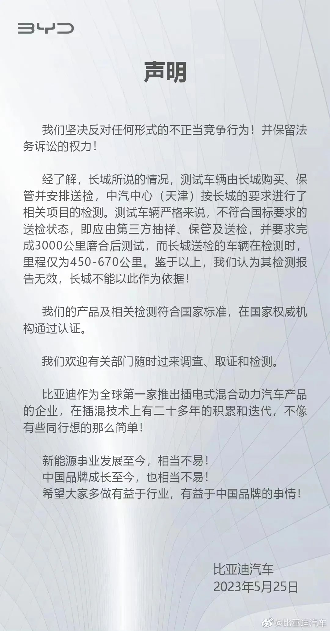 “我们坚决反对任何形式的不正当竞争行为,并保留法务诉讼的权利。我们的产品及相关检测符合国家标准,在国家权威机构通过认证。”5月25日,就被长城汽车举报“比亚迪秦PLUS DM-i、宋PLUS DM-i采用常压油箱,涉嫌整车蒸发污染物排放不达标的问题”,比亚迪发布声明表示。