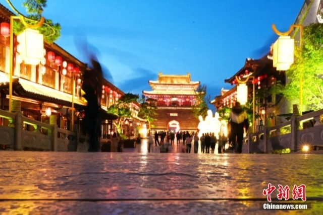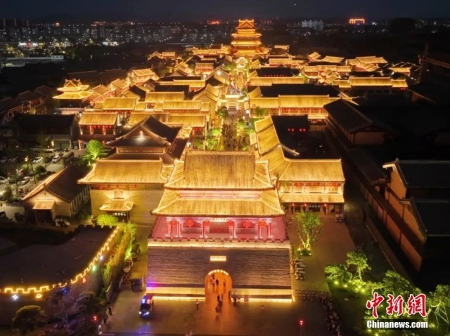 山东日照莒县历史悠久,位于该地的莒国古城有春秋第一城之称。如今,“焕然一新“的莒国古城按照莒地历史文脉传承,建设莒王宫、城阳王府、雕龙苑、文昌阁等十大景点,立体展现春秋、汉、唐、明、清建筑艺术和宫廷、军事、科举、市井等文化,项目入选山东省新旧动能转换、乡村振兴、文化旅游三个重大项目库。图为航拍日照莒国古城夜色。(图片来源:中新图片)