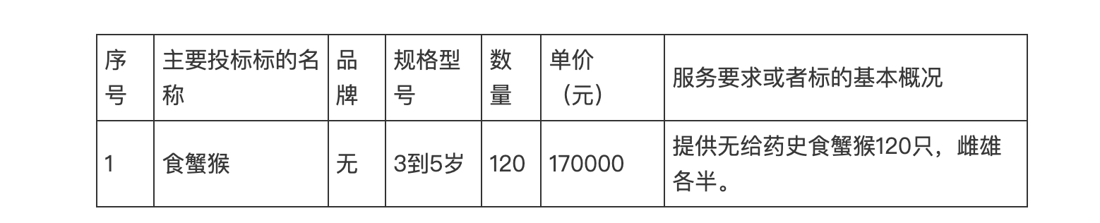 据中国政府采购网2023年4月公布的《中国食品药品检定研究院食蟹猴采购项目中标公告》,该批食蟹猴的预算采购价为2240万元。最终,120只食蟹猴的中标价格为2040万元人民币,食蟹猴单价为17万元/只。此前,根据中国政府采购网“中国食品药品检定研究院实验用食蟹猴采购项目”2022年公布的结果,两次采购食蟹猴的价格分别为18.4万元/只和19.4万元/只。而在2020年的项目公示中,采购400只实验用食蟹猴的预算金额为1200万元,即每只3万元。