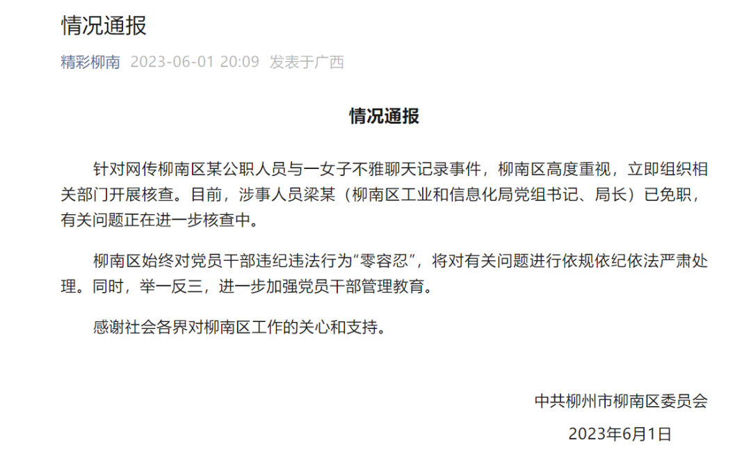 针对网传柳南区某公职人员与一女子不雅聊天记录事件,柳南区高度重视,立即组织相关部门开展核查。目前,涉事人员梁某(柳南区工业和信息化局党组书记、局长)已免职,有关问题正在进一步核查中。