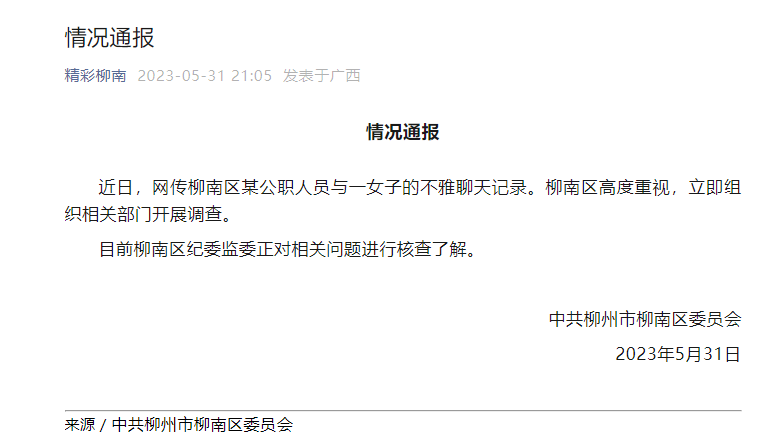 6月1日,广西柳州柳南区精彩柳南官方微信账号发布情况通报: