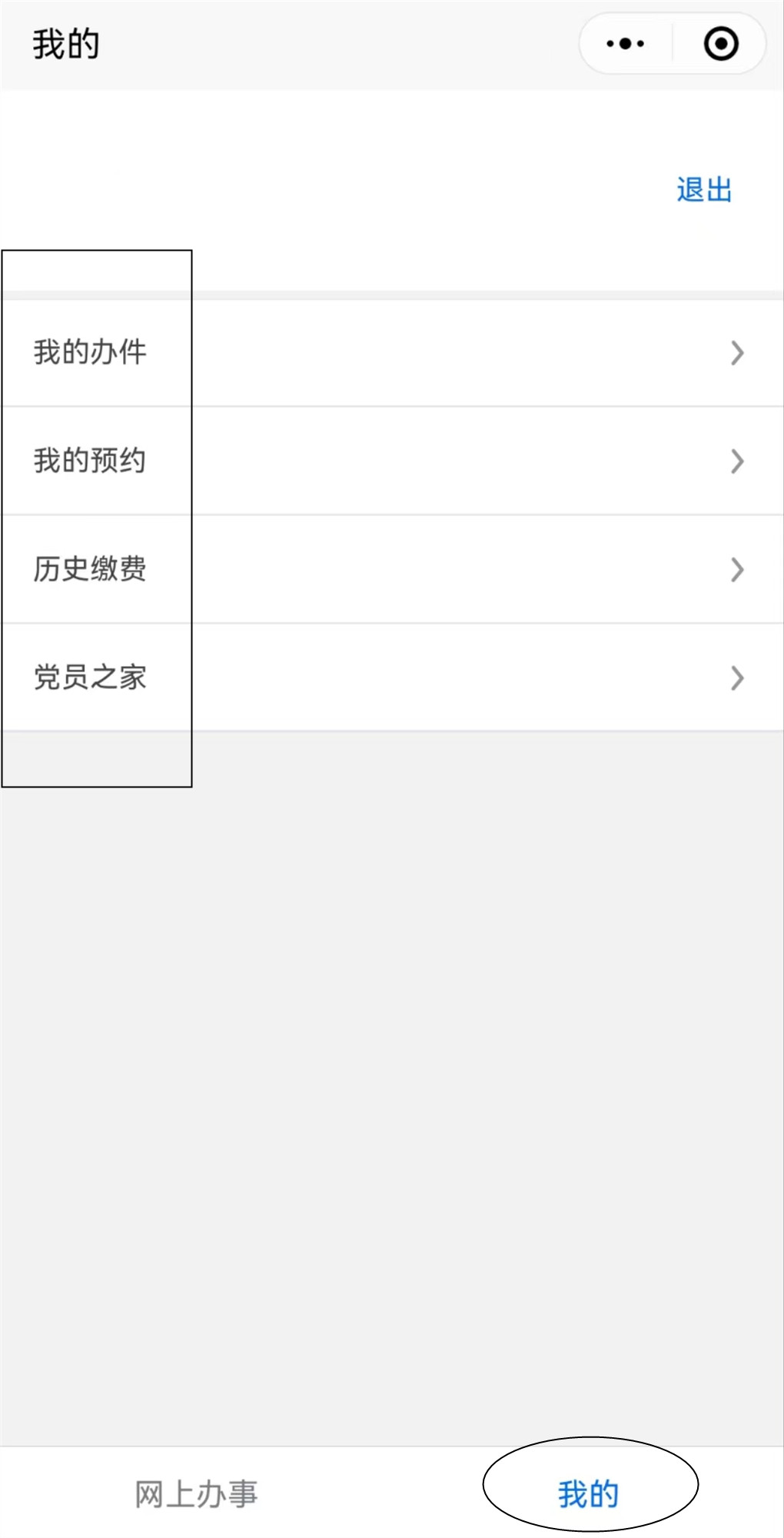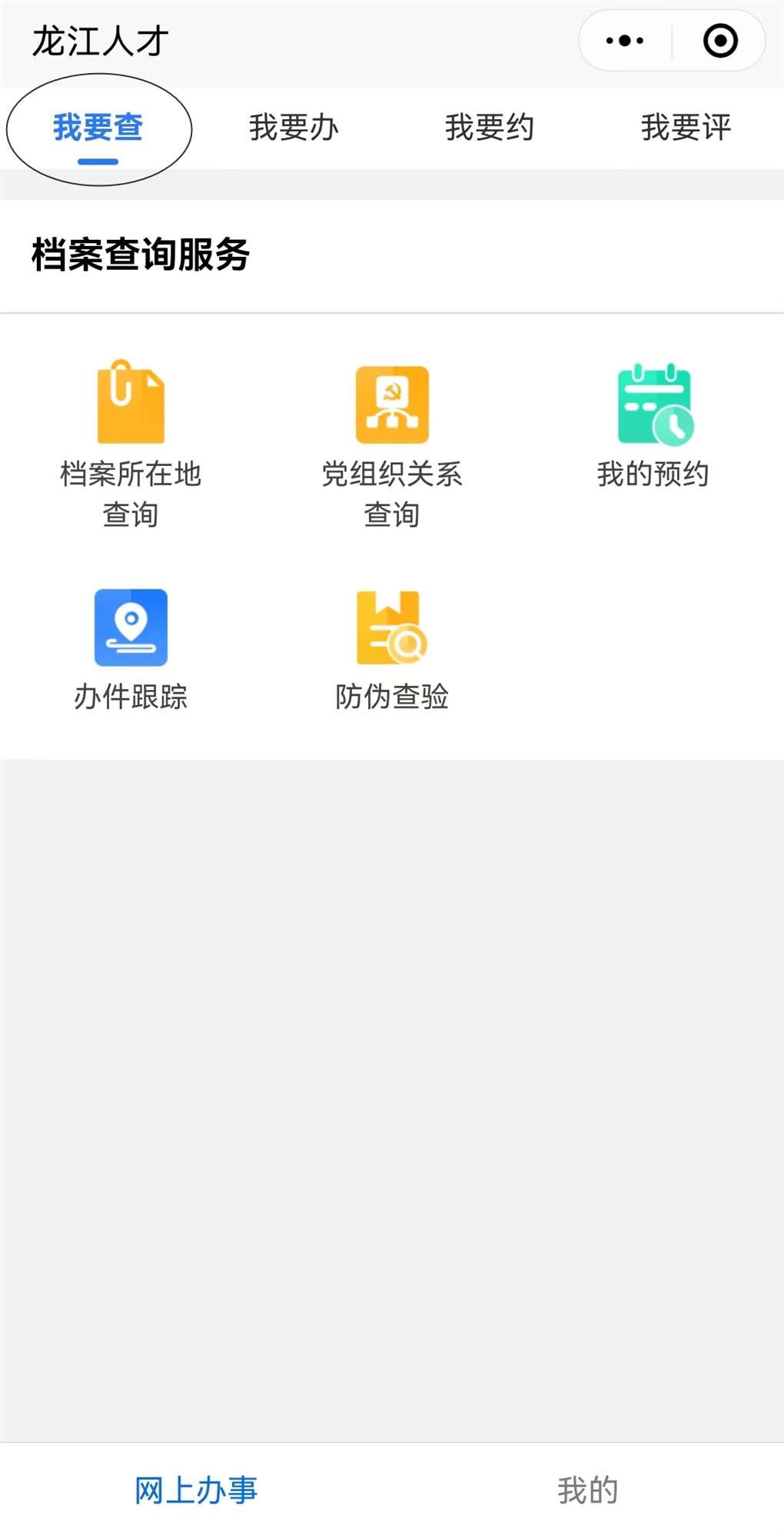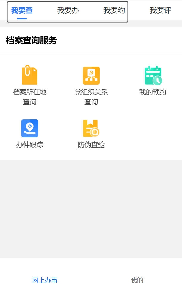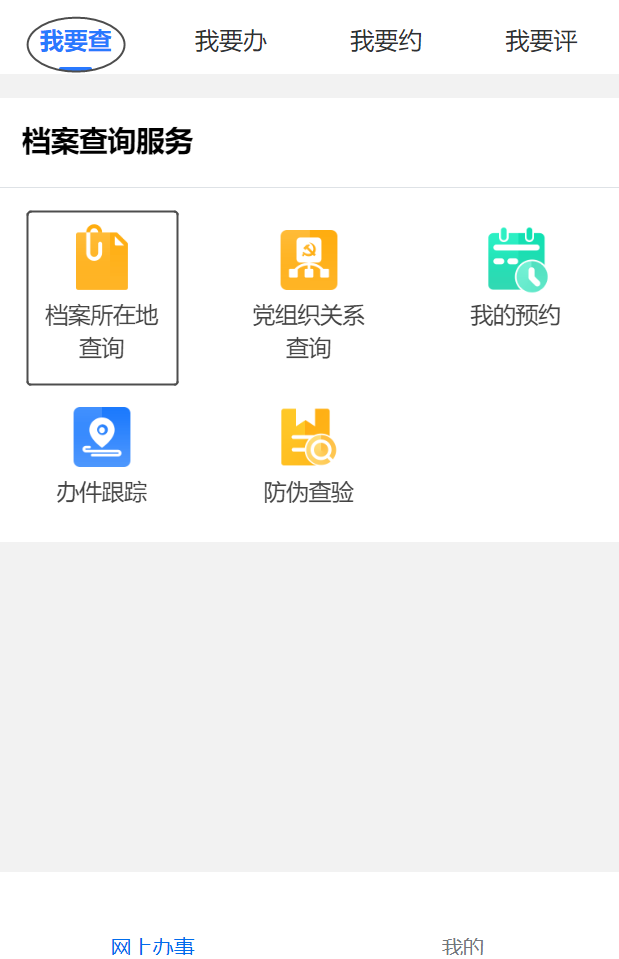 点击“网上办事”—“我要查”,查询党组织关系、我的预约、办件跟踪等信息。