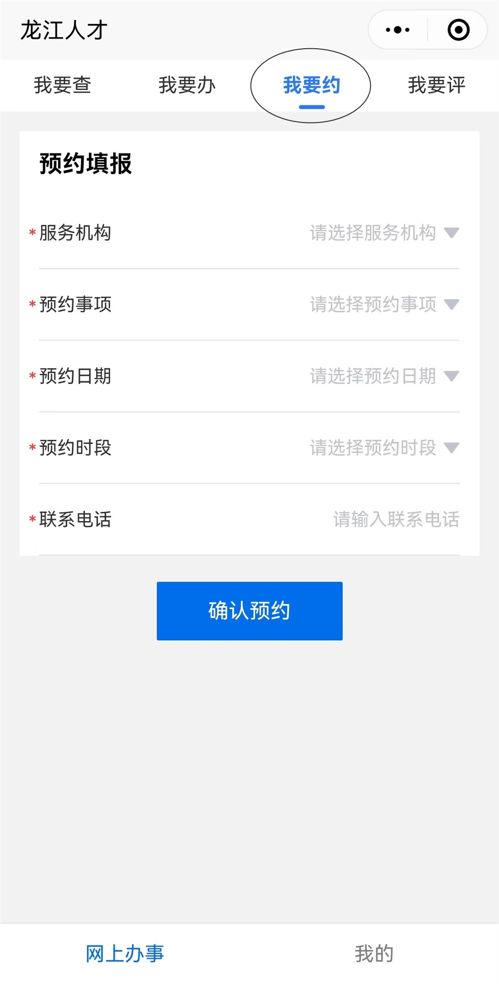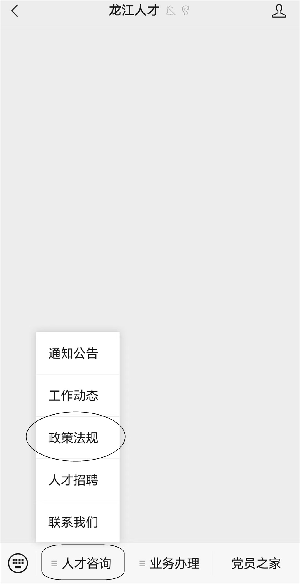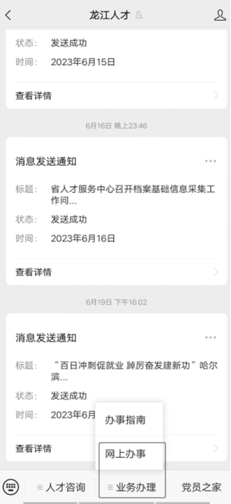 进入“龙江人才”微信公众号后, 点击“业务办理”—“网上办事”(小程序无此步骤)。
