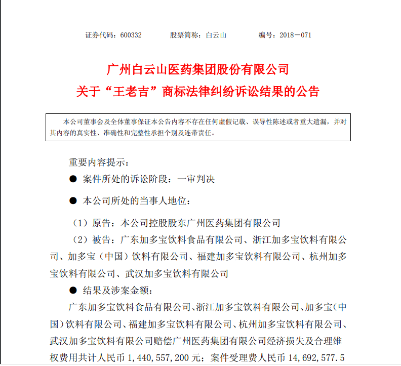 据广药集团子公司白云山2018年7月公告,广东高院关于“王老吉”商标法律纠纷案件的一审《民事判决书》显示,广东加多宝饮料食品有限公司、浙江加多宝饮料有限公司、加多宝(中国)饮料有限公司、福建加多宝饮料有限公司、杭州加多宝饮料有限公司、武汉加多宝饮料有限公司(合称为“六加多宝”)被判赔偿广药集团经济损失及合理维权费用共计人民币14.41亿元。