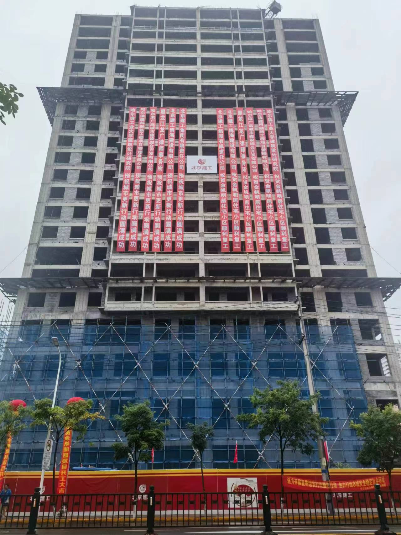 经道外区多方协调联络和全力推进,2023年初,北京建工渤海建设有限公司接手金帆名居复建工程。2023年8月12日,举行项目复建开工仪式,标志金帆名居正式开始复建。据道外区征收办介绍,有关部门对项目设计、安全鉴定及加固方案等复建事宜进行了反复论证,最终确定两栋建筑的主体楼体目前没有问题,可以继续建设。