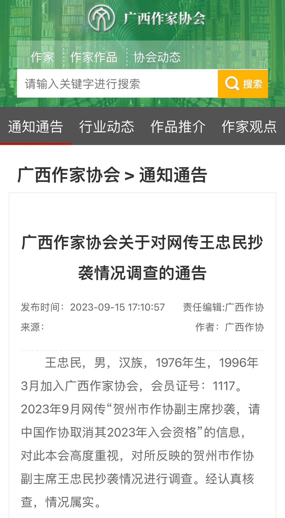 2023年9月15日,广西作家协会在广西文联网发布《关于对网传王忠民抄袭情况调查的通告》称,“对所反映的贺州市作协副主席王忠民抄袭情况进行调查。经认真核查,情况属实。”同时表示:协会认为王忠民不具备申报中国作协会员资格,于9月14日向中国作协申请撤回对他的推荐;同时依据相关章程撤销王忠民贺州市作协副主席职务、取消贺州市作协会员资格。